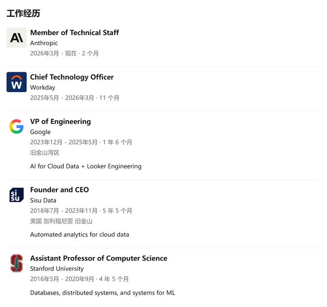 贝里斯的经历颇具代表性,斯坦福助理教授、创业者、谷歌云工程副总裁、再到Workday CTO,几乎走遍了企业软件与AI交叉领域的每一站。