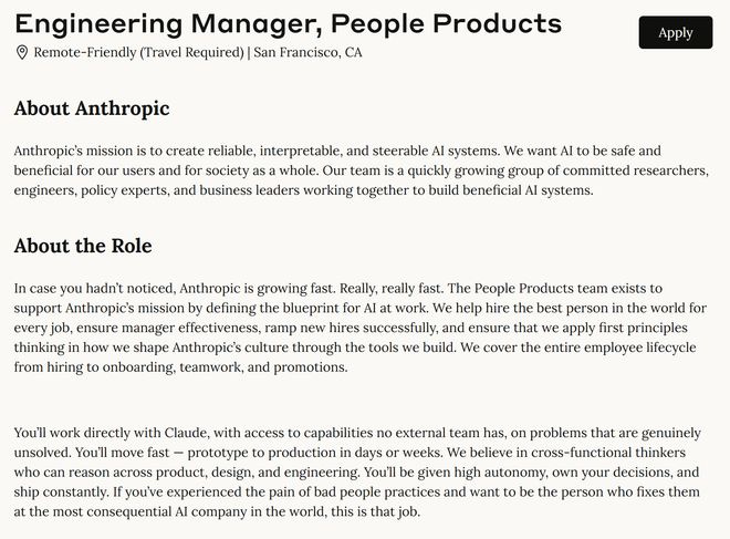 此外,Anthropic还组建了一个专门的研发团队来开发涵盖招聘、培训和晋升管理的“人事产品”。这表明该公司正在将业务扩展到Workday的核心领域。值得注意的是,在发布招聘信息时,公司明确表示优先考虑具有Greenhouse、Workday或Rippling等人力资源技术平台经验的人才。