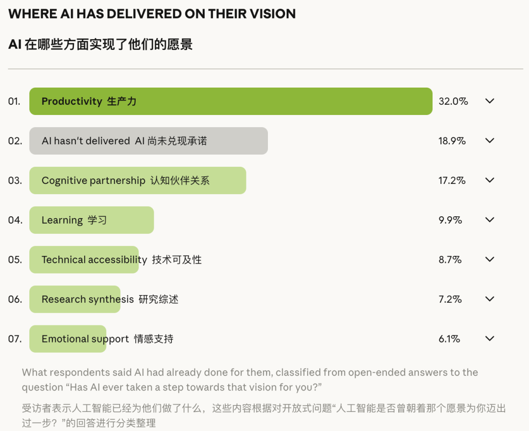 在调查中,AI帮助用户提升生产力是最常见的场景,占到了32%的比例。