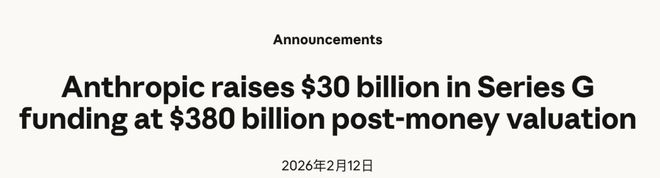 2月12日,Anthropic完成了广受关注的Series G融资:募资300亿美元,对应估值3800亿美元。本轮由GIC与Coatue领投,微软与英伟达等也参与跟投。