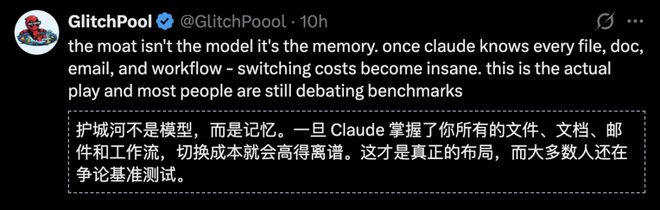 它在你的应用里待的时间越长,就越了解你的工作流。Claude在应用中每多停留一秒,竞争对手就越难与之抗衡。