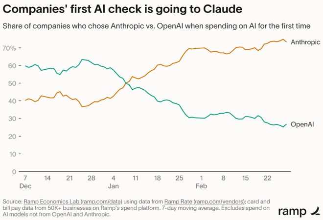 Ramp 经济学家 Ara Kharazian 在最新报告中指出,在初次购买 AI 服务的企业里,Anthropic 占据优势的比例高达 70%。