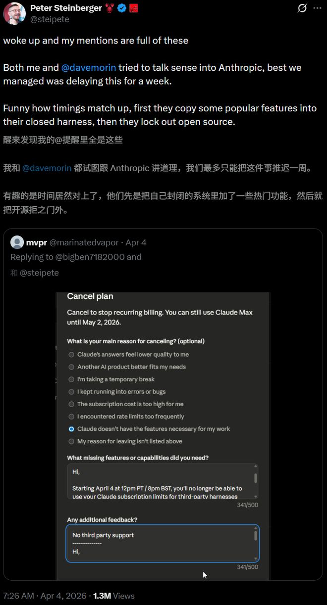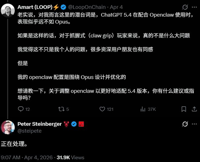改价公告发出当天,一位用户在推文下面抱怨:自己的OpenClaw配置是围绕Claude Opus设计的,ChatGPT 5.4跑起来远不如Opus,想请教怎么迁移。