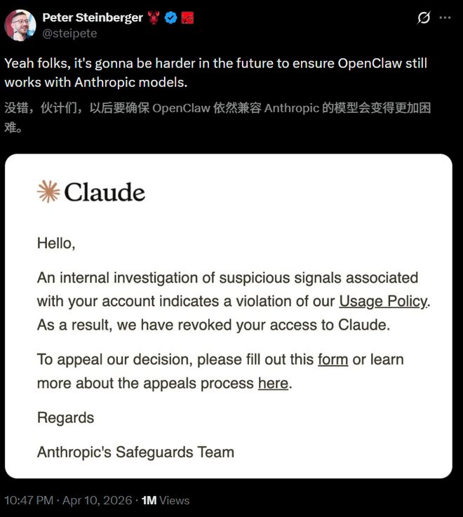 一位名为Peter Steinberger的开发者发帖称,他收到了一封来自Anthropic的邮件,导致他的Claude账号被封。