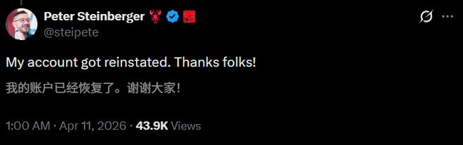 不久后,Steinberger又在社交媒体上发布了一则更新:他的账户已经被恢复了。