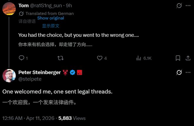 Anthropic当时要求Steinberger迅速更改项目的名称,并且警告说如果不这样做可能会面临法律行动。
