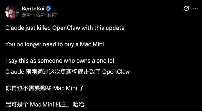 Claude这次更新直接杀死了OpenClaw。你不再需要买Mac Mini了。我说这话的时候,手边就放着一台。
