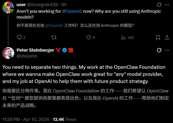 你得分清楚两件事。我在OpenClaw基金会的工作,是让OpenClaw可以很好地配合任何一个模型提供商。我在OpenAI的本职工作,是帮他们想清楚未来的产品策略。