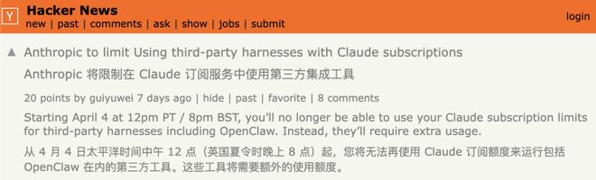 此前的几周里,Anthropic已经宣布了一项新的政策:Claude订阅将不再支持包括OpenClaw在内的第三方工具使用。