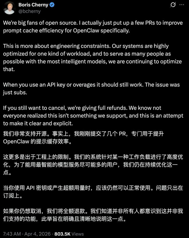 而Boris Cherny更是早在改价生效之前,他就亲手给OpenClaw提交过几个PR,专门优化prompt cache效率,试图从技术层面降低第三方调用的成本压力。