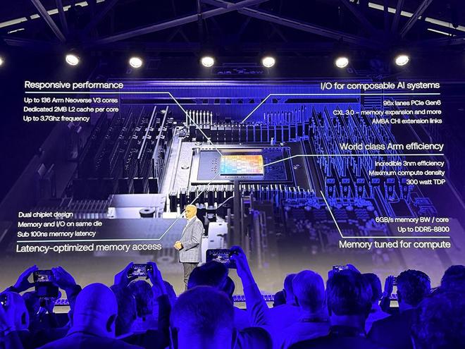 Arm AGI CPU采用台积电3nm工艺,双Chiplet设计,单颗CPU集成了136个高性能核心,配备2MB L2缓存,支持3.7GHz主频,提供每核心6GB/s内存带宽,内存延迟低于100ns,采用96通道PCIe Gen 6接口,支持CXL 3协议,热设计功耗为300W。