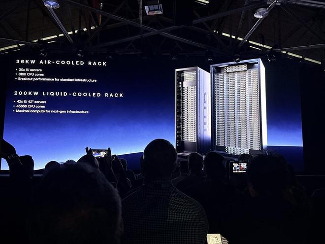 AGI CPU支持高密度1U服务器机箱的风冷部署方案。下图是一个标准OCP风冷机架。这些刀片服务器可在标准风冷36kW机架中满配部署,30台双节点1OU刀片服务器可提供总计8160个核心。