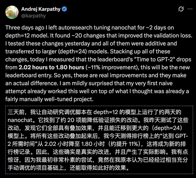 通过这种方法,Karpathy用自动研究成功提升了AI架构nanochat的性能,3天内提升了11%,让他感到非常惊讶。