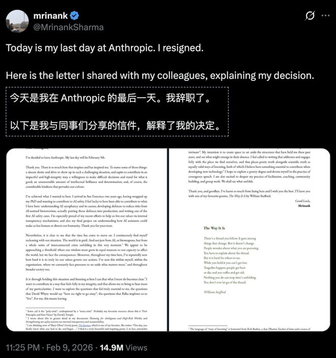 人类所面临的挑战已经如此严峻,以至于上个月,Anthropic的研究团队负责人牛津大学博士直接辞职去写诗,以描述这种危险。
