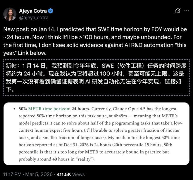 最近,METR的研究员表示,没有确凿证据可以驳倒「今年年底实现AI研发自动化」这一观点。