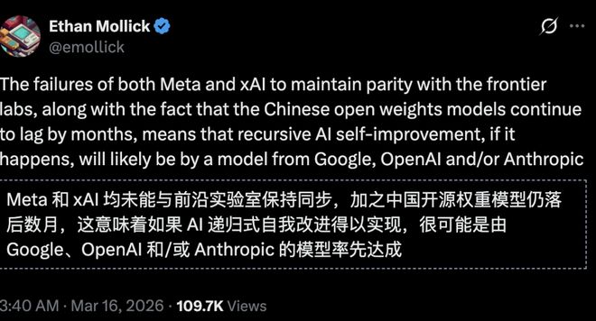 如果AI递归自我改进得以实现,很可能最先由谷歌、OpenAI或Anthropic的模型实现。