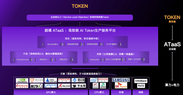 为了应对当前行业的关键难题,趋境ATaaS平台利用四大自主研发的核心技术模块,构建了覆盖异构整合、智能调度和弹性扩容的全链路能力。平台将算力和能源封装为分层、面向具体应用场景的高效能Token服务,为国产算力的提升、异构算力孤岛的破解,以及规模化降本增效,提供了具有代表性的中国解决方案。
