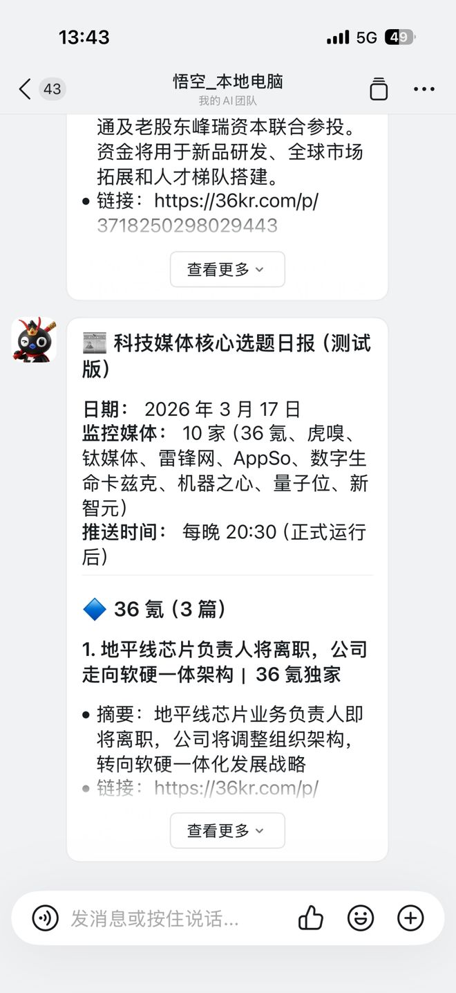 这个需求在过去的执行方式,要么是我自己某个固定时间逐一打开公众号翻看,要么安排一名实习生每天做这份信息整理工作。看起来是小事,但真正尝试让悟空来做,才发现它并不简单。