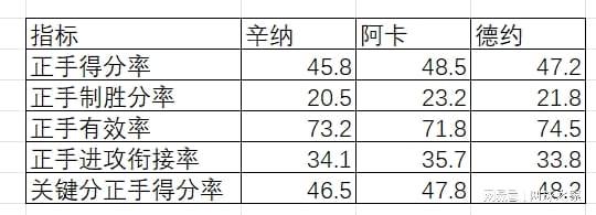 (2)效率维度:阿卡拉斯在正手得分率和制胜分率方面领先,终结能力最强;德约科维奇的正手有效率和关键分得分率最高,稳定性顶级;辛纳的各项效率均衡,衔接流畅。