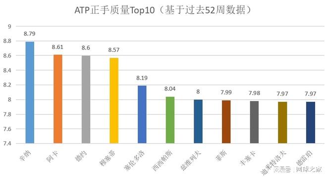 根据上述三大类指标,ATP公布了过去52周正手质量Top10的榜单。