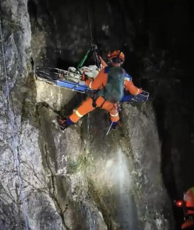 方案确定后,救援人员在悬崖上方实施精准作业,依托多重安全锚点与双绳保护系统,采用“上下协同、分段转运”的方式,在漆黑的悬崖上开辟出一条生命通道。上方救援人员利用系统下降器缓慢释放救援绳,下方救援人员扶稳担架、稳步缓降——每一步都精准发力,每一次操作都严格规范。晚上10点36分左右,他们成功将伤者转运至安全区域,并移交给现场医护人员送医救治。