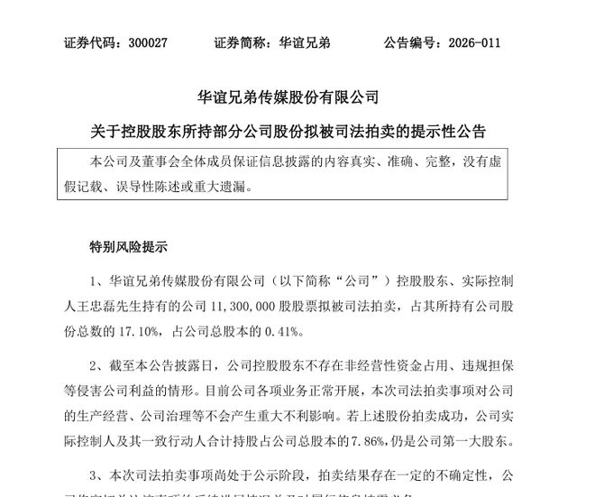 华谊兄弟(300027.SZ)的实际控制人之一王中磊所持有的1130万股股份即将被拍卖。
