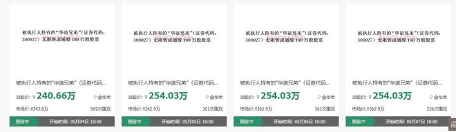在京东资产交易平台查询后发现,这些股票已经被列入了六个不同的拍卖品,起拍价从241万元到254万元不等,拍卖时间安排在5月4日至9日之间每天上午十点进行。