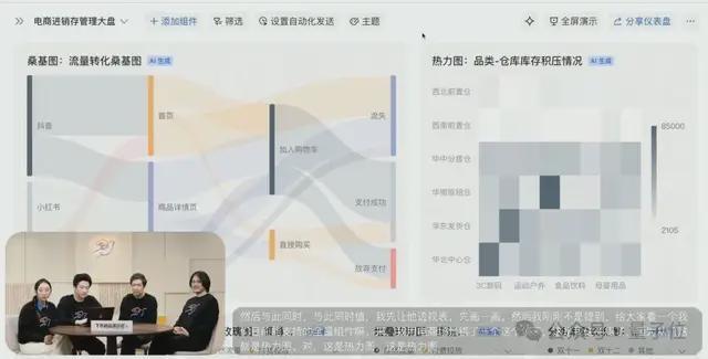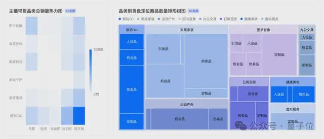 罗砚在现场再次用AI生成图表和AI问数,秒出了不同主播带货品类的销量表现热力图,并对不同账号的直播效率进行了多维度归因。