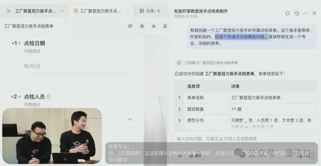 例如:“为我定制一款适用于工厂扭力扳手的检查表单。这款扳手用于拧紧轮胎,请生成一份详尽的专业表格。”