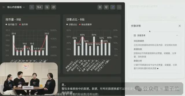 多维表格的AI搭页面功能开始自动运转,几分钟后,一个带有3D滚动动画、数据可实时交互、甚至连文案都自带高情商(例如自动总结出“平均观看时长20分钟,深度内容依然被需要”)的H5级项目战报页诞生了!