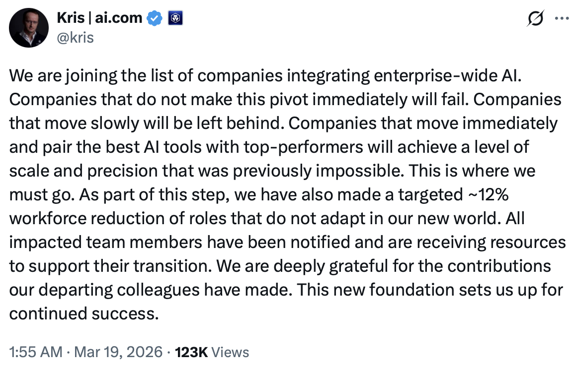 这一趋势本周仍在延续,Crypto.com计划进一步裁员约12%,首席执行官Kris Marszalek在X平台上警告称,“那些未能立即转型的公司都将失败。”