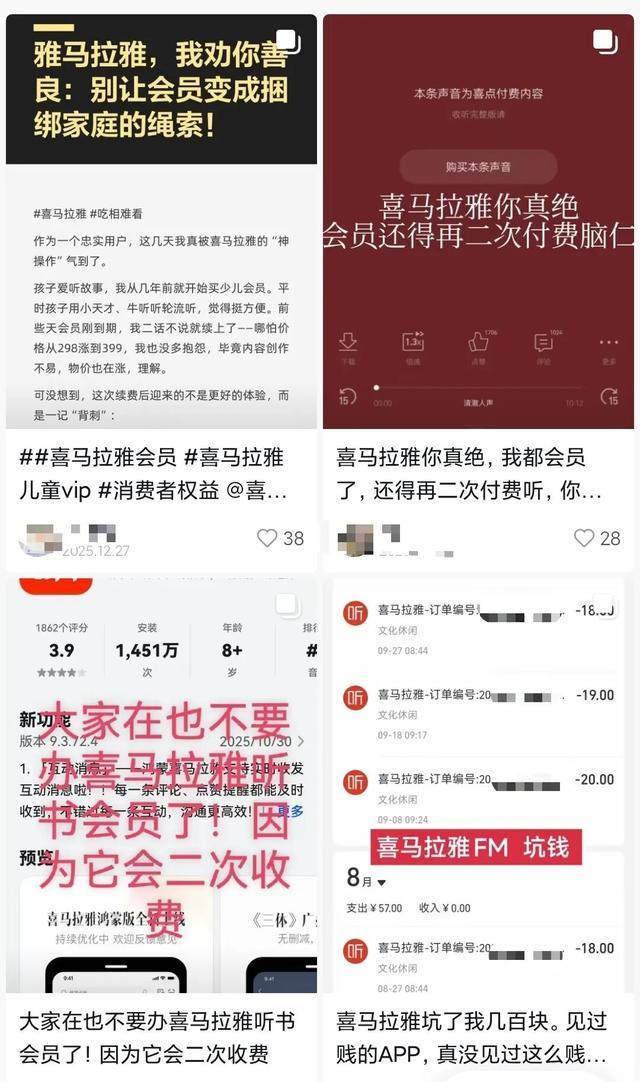 在社交媒体上搜索发现,许多用户都表达了类似的不满情绪。“喜马拉雅会员”的话题下有不少人提到自己遇到的问题:比如网友@虎柴柴曾于2025年12月27日发文称,她的两个孩子原本可以共用一个喜马拉雅少儿会员账号。但自从那次更新后,费用从289元上涨到了399元,并且每个手表也必须分别开通一个VIP。
