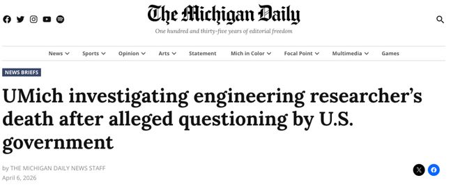 根据密歇根大学警察局副局长兼公共信息官梅丽莎·奥弗顿在4月1日的邮件中透露的信息显示,3月19日,一名助理研究科学家(即汪丹浩)从乔治·G·布朗大楼的三楼跳下坠落到二楼,并于次日不幸去世。