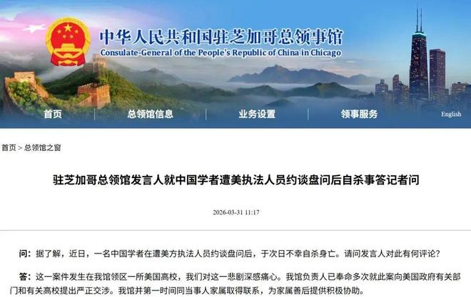 在事件发生的四天后,即三月三十日,中国驻芝加哥总领馆表示:“这一悲剧发生在我们管辖范围内的美国一所大学内,我们对此深感痛心。我方已多次向美方相关部门和有关高校提出严正交涉,并与当事人家属取得联系,提供了积极协助。”