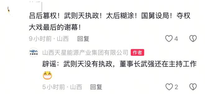 然而,3月20日,另一个同样名为“山西天星能源产业集团有限公司”的抖音账号发布了“董事长变更为王燕不属实”的视频。该视频称,王燕当选为天星集团公司董事会董事长的文件,有多处不符合公司现行文件格式,“文件一眼假,是她自己打印自己盖章的”。该视频称,正式使用20多年的公章在公司,并未丢失或失控,而王燕谎报丢章后刻的新章在她自己手里,两章编码不同。视频中还说,发布上述文件的社媒账号没有企业认证,系已被免职的员工杨某的个人账号。20日,该账号在评论区回复网友评论称,董事长武强以企业大局公司稳定为重,不愿参与舆论口水战,以家族和股东利益为先,个人名誉为后,对负面造假信息不予回应,针对王燕团伙对其个人的恶意造谣、不实言论保持克制,但面对继续抹黑天星、破坏公司稳定的行为,不能坐视不管,并称:请大家认准我们官方抖音号,我们是企业官方认证号,以此信息为准。该账号称,武强是王长青的儿子,王燕为王长青的女儿,两人是同父同母亲兄妹。有网友评论称“吕后篡权,武则天执政,太后糊涂,国舅设局,夺权大戏最后谢幕”,该账号回复:“辟谣,武则天没有执政,董事长武强还在主持工作。”记者注意到,该抖音账号得到平台蓝V认证,并公布了营业执照。