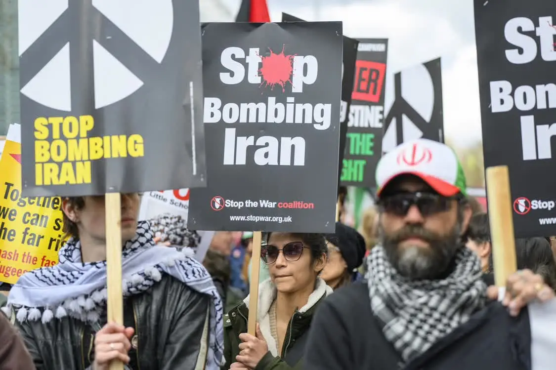 3月28日,人们在英国伦敦参加集会,抗议美国和以色列对伊朗发动军事打击。新华社发(雷伊·唐摄)