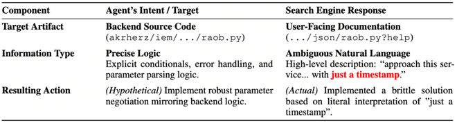 信息景观的鸿沟。搜索引擎经过几十年优化,擅长检索人类可读的高层文档。但代码任务所需的关键知识,往往深埋在源文件、commit diff和issue评论的只言片语中——搜索引擎对这类「技术原始制品」的索引能力天然不足。Agent拿到的是"概念上正确"的文档摘要,但它真正需要的是"逻辑上精确"的源码细节。