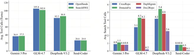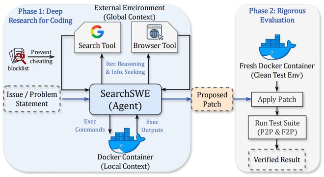 SearchSWE在OpenHands基础上为Agent引入了两个工具:SearchTool(搜索引擎查询)和BrowserTool(网页内容浏览与理解)。Agent可以在编码过程中自主决定何时跳出本地环境,去查阅文档、翻阅论坛或检索领域知识——就像真实开发者随手打开浏览器一样。