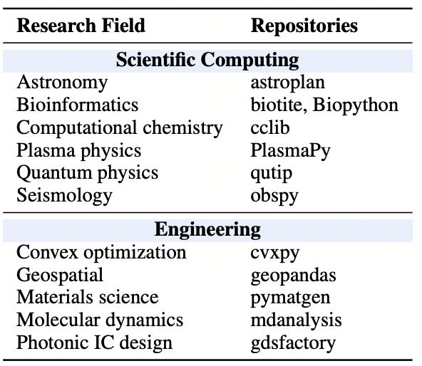 该任务由来自11个学科方向的领域专家合作构建,涵盖量子物理(QuTiP)、生物信息学(Biotite)、凸优化(cvxpy)、天文学(astroplan)、等离子体物理(PlasmaPy)等高难度领域。