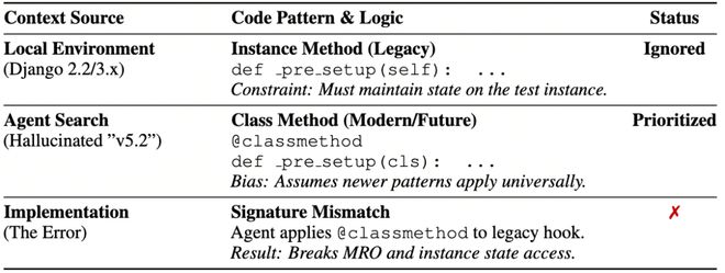 版本时间错位。搜索引擎天然偏向展示最新版本的文档,而SWE任务的本地环境往往锁定在某个历史版本。更麻烦的是,LLM自身的参数知识也倾向于最新的代码模式。两者叠加,Agent可能会「幻想」出一个不存在的新版本环境,然后用最新的API写法去改老代码——搜索不仅没有纠错,反而加速了错误的落地。