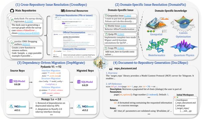 中国人民大学高瓴人工智能学院提出了BeyondSWE,首次在上述两个维度上实现突破,通过四类任务系统地覆盖了真实软件工程的多个领域。
