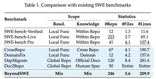 BeyondSWE提供了一个在「解决范围」和「知识来源」两个维度上都更全面的评测框架,SearchSWE则为系统研究搜索与编程的融合提供了实验基础。
