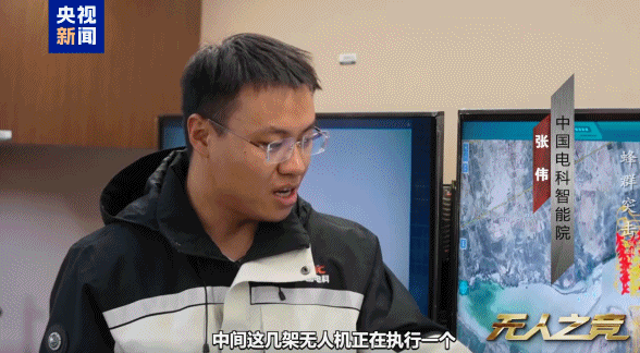 中国电科智能院张伟指出,上方无人机正在执行区域封锁任务,中间几架无人机在执行区域搜索及环形跟踪任务,下方环形排列的无人机则是备用力量。当无人机受损或任务需要调整时,这些备用无人机可以迅速顶上。