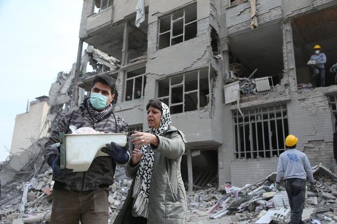 3月12日,在伊朗首都德黑兰,市民站在建筑废墟前 新华社记者沙达提摄