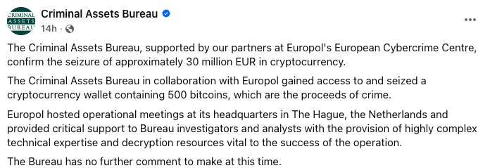 Cointelegraph已联系刑事资产调查局和爱尔兰国家警察,以获取进一步的评论。