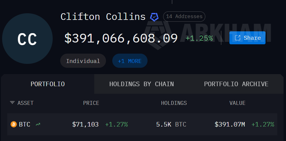 Arkham的数据显示,Collins名下的14个地址中持有总计5500枚比特币,当前价值超过了3.91亿美元。