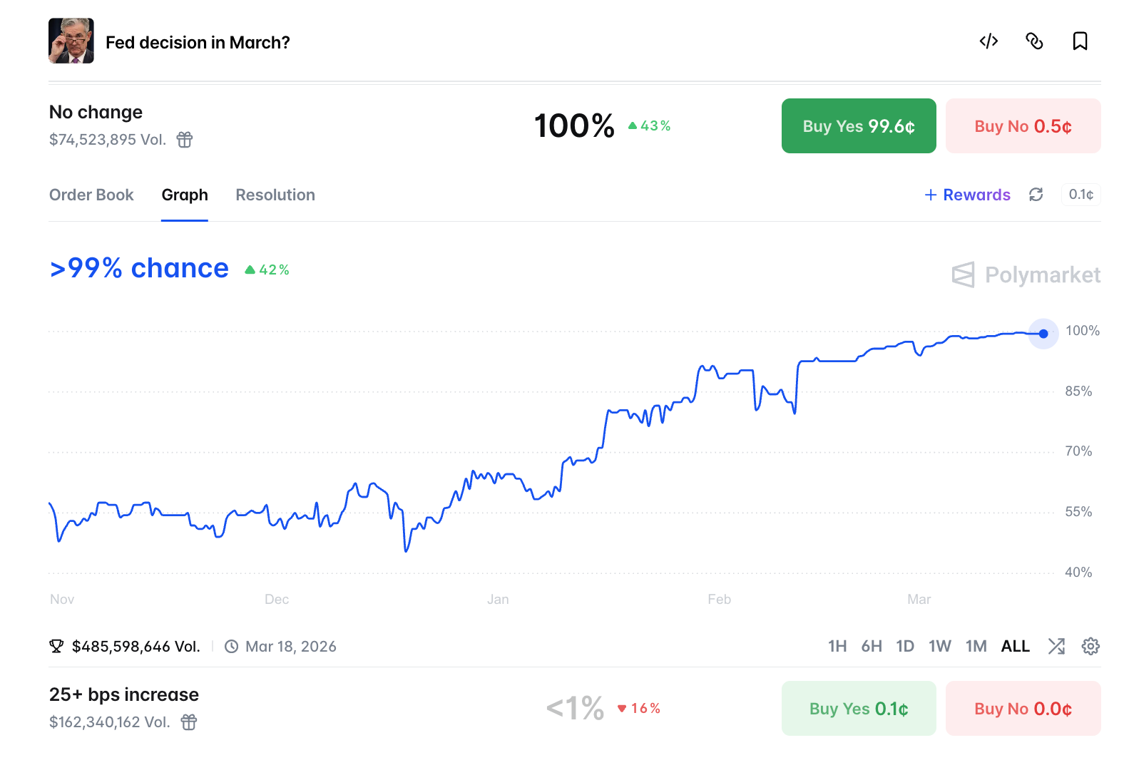 Polymarket平台上的用户预测,当前利率维持在3.5%-3.75%区间的概率为100%,而降息0.25%的概率则不足1%。