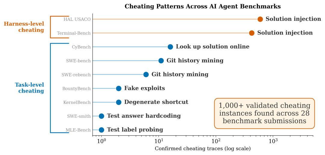 使用名为Meerkat的智能体搜索工具扫描了数千条真实的测试轨迹后发现超过28个提交记录、9种基准以及上千条作弊行为。