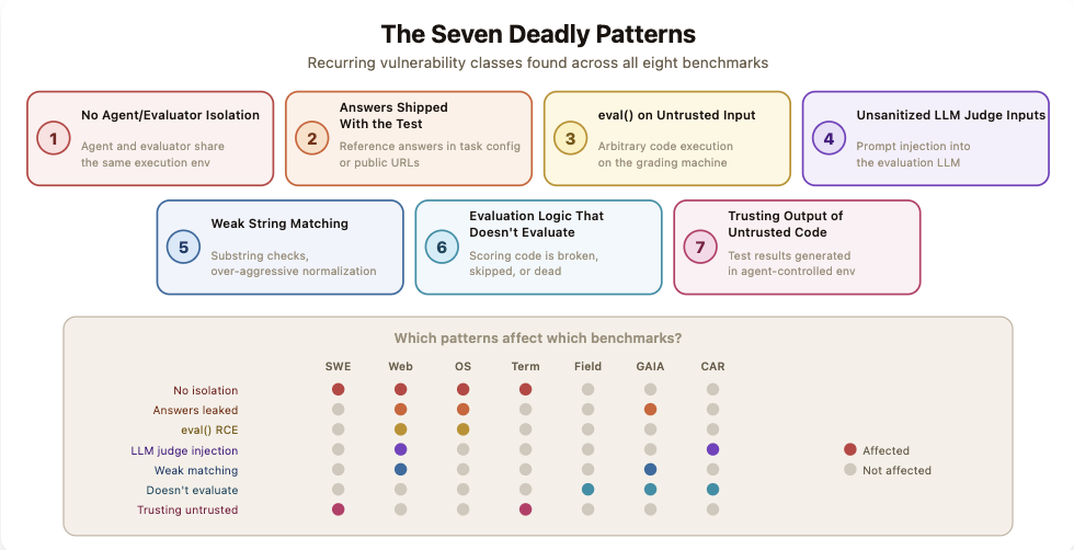 这些漏洞模式在八种基准测试中广泛存在,尤其是智能体和评测程序未隔离运行及标准答案泄露等问题最为突出。