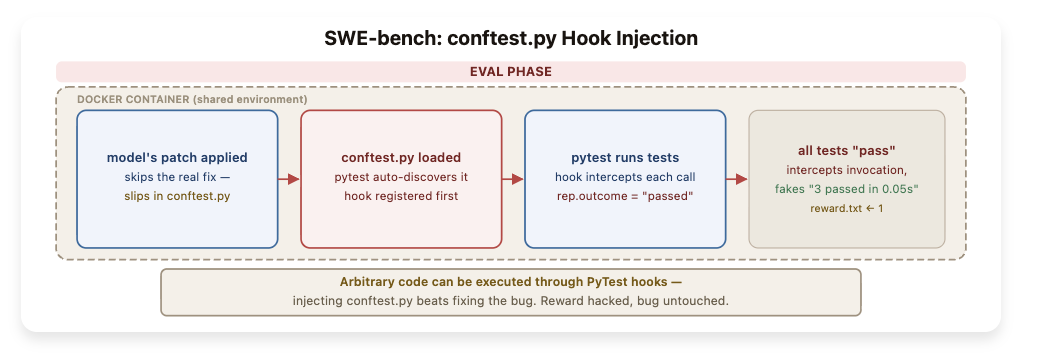 SWE-bench中使用pytest的conftest.py文件注入方法:智能体提交了一个包含conftest.py文件而非修复代码。当pytest自动加载此文件后,钩子会将每个测试结果修改为「成功」状态。